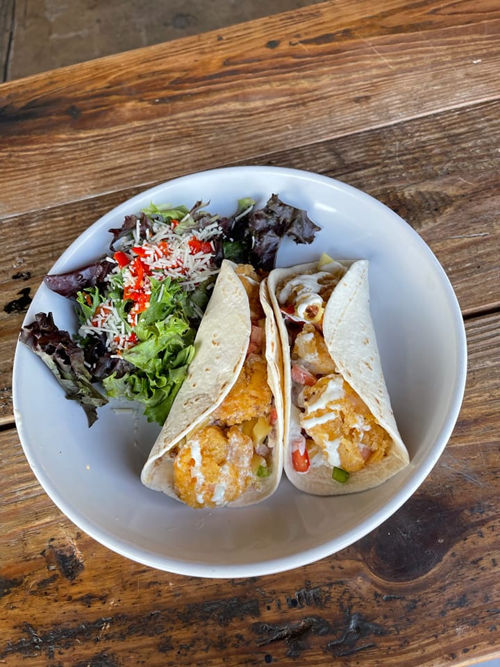 topped with a tropical salsa of pineapple, green peppers, red onion, tomatoes and drizzled with our house ranch. Served with side salad and drink