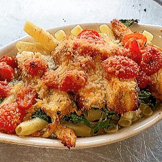 ziti noodles then is topped with our house alfredo, spinach, oven roasted tomatoes, parmesan, and your choice of chicken or shrimp.