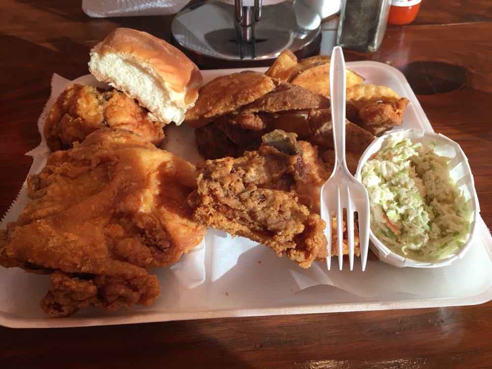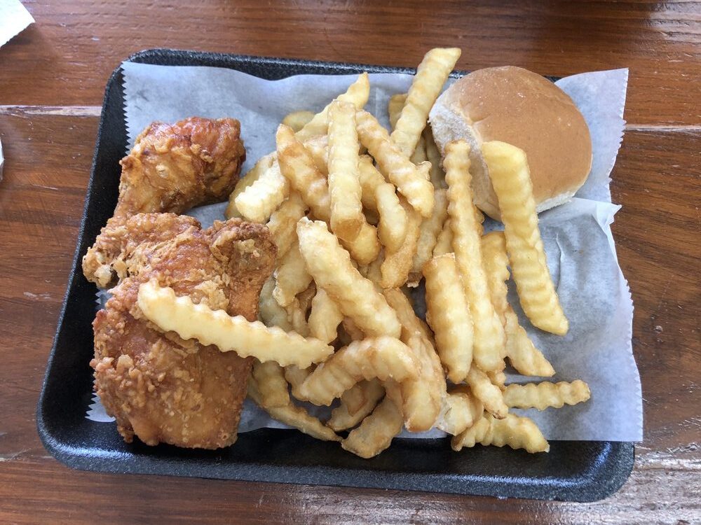 Two pieces of freshly fried chicken. It comes with a side and a roll.