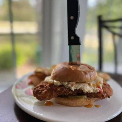 Fried chicken breast topped with pimento cheese and pepper jelly in between a brioche bun.