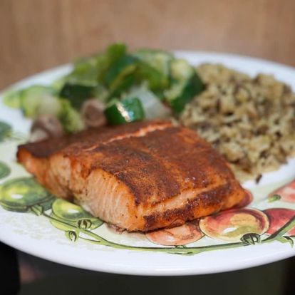 Fresh 7 oz wild caught salmon filet with cajun seasoning baked and topped with pure honey. Served with wild rice and grilled veggies.