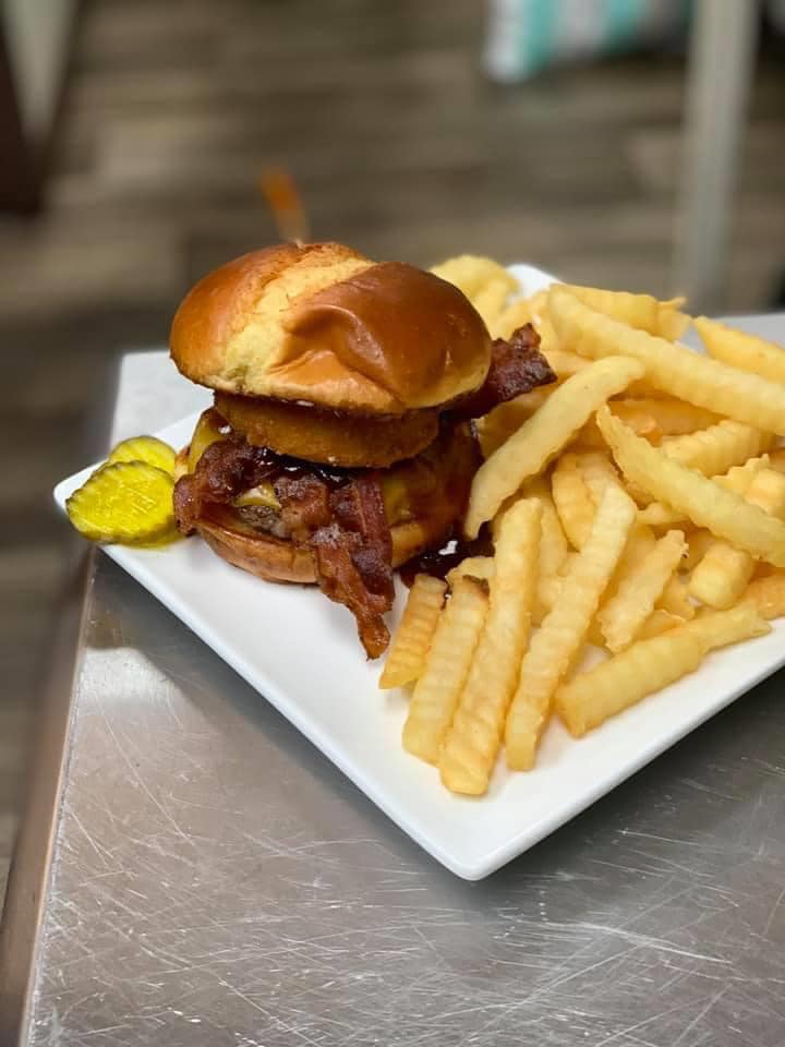 1/3 lb hand patted burger topped with cheddar cheese bacon bbq sauce and a onion ring. It is served with macaroni salad or french fries.