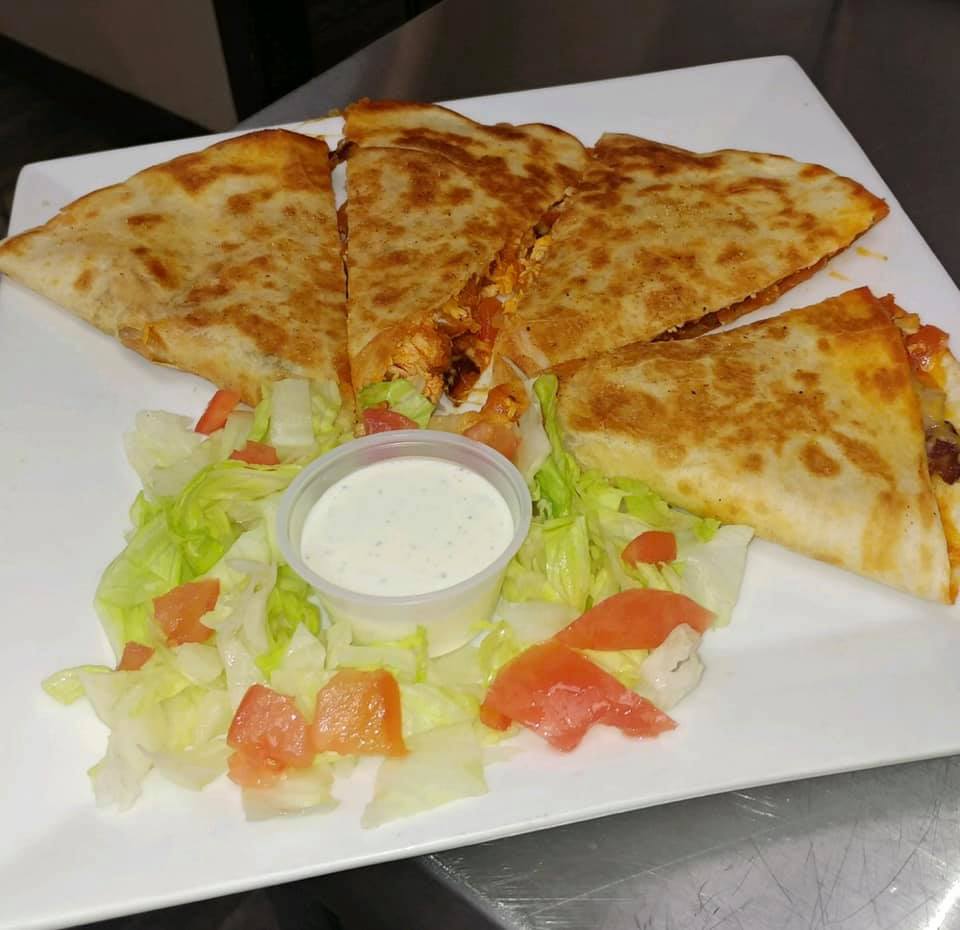 Fried or grilled chicken with sautéed onions and tomatoes, cheese and buffalo sauce. It’s comes with a side salad with your choice or ranch or blue cheese.
