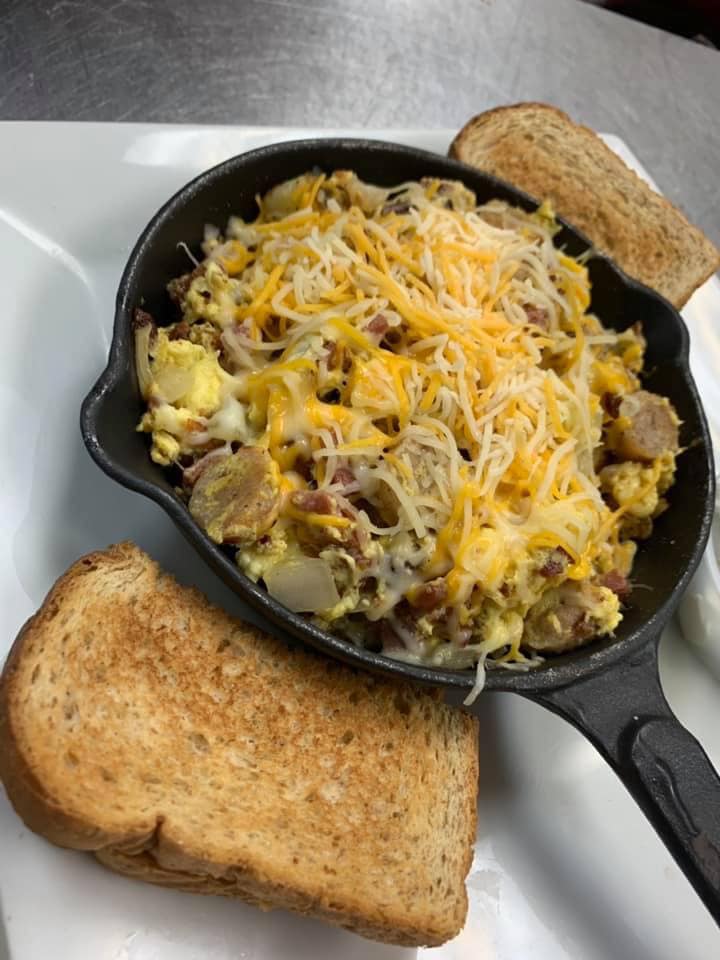 Ham, sausage and bacon scrambled into 3 eggs with cheese served on top of a bed of home fries. That comes with toast or a biscuit.