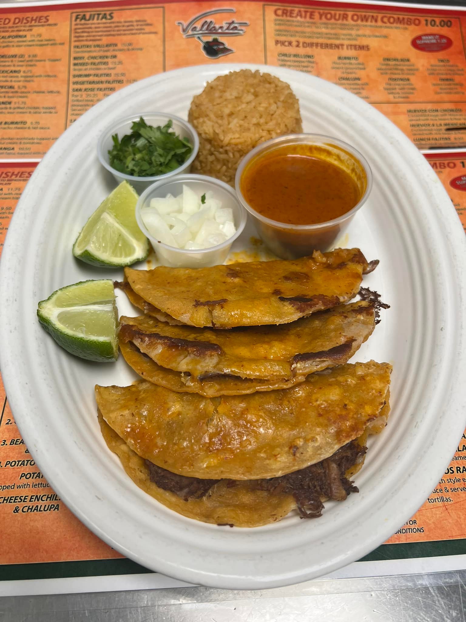 Three corn tortillas stuffed with cheese, beef birria style, fresh cilantro, and onions. Served with birria broth for dipping and tomatillo sauce.