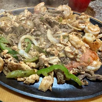 A combination of steak, chicken, and shrimp served with mexican rice, beans, lettuce, guacamole, sour cream, pico de gallo, and flour tortillas. The filling is marinated in our special recipe. Fajitas are delivered sizzling hot on a bed of tomatoes, onions, and peppers.